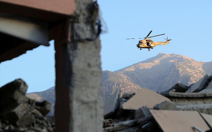 ↑2023年9月12日,救援直升机在震中区域的摩洛哥豪兹省塔拉特恩雅库布村附近飞行。