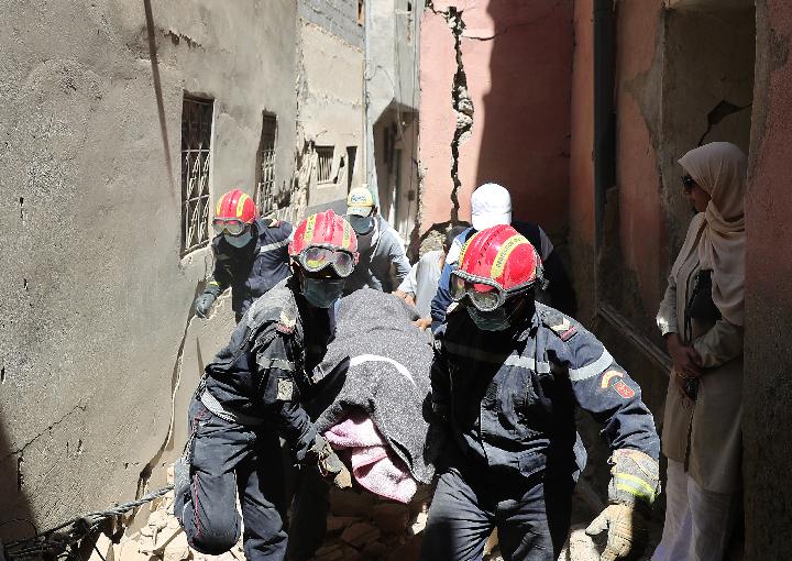 ↑2023年9月10日,在摩洛哥震中附近的艾米兹米兹村,救援人员在搜救工作中搬运一名遇难者的遗体。
