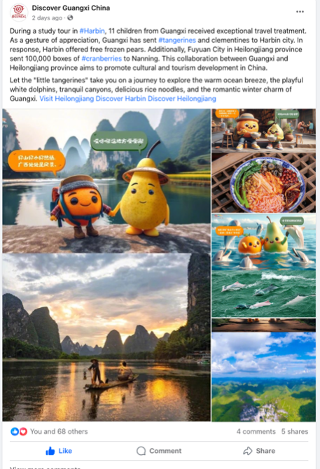 广西Facebook专门制作了海报帖文,答谢“东北老铁”对“小砂糖橘”们的暖心守护,海报上卡通版的“小砂糖橘”与“冻梨”手牵手,还一起品尝了广西的米线。
