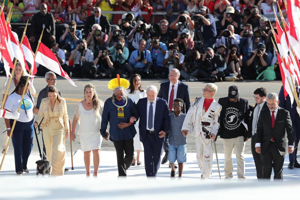 就职仪式上,全场奏响巴西国歌,现场民众将一面巨大的国旗传递至总统府前。卢拉背对着记者,但能感受到他的心情有些激动,总统夫人站在他的右侧,用自己的左手一直轻抚卢拉的后背。在总统府发表完演说之后,卢拉转过身来举起只有四个手指的左手(21岁时,还在工厂干活的卢拉由于意外机器事故割断了一个手指),向在总统府殿内等候的政要、部长、媒体和嘉宾致敬。