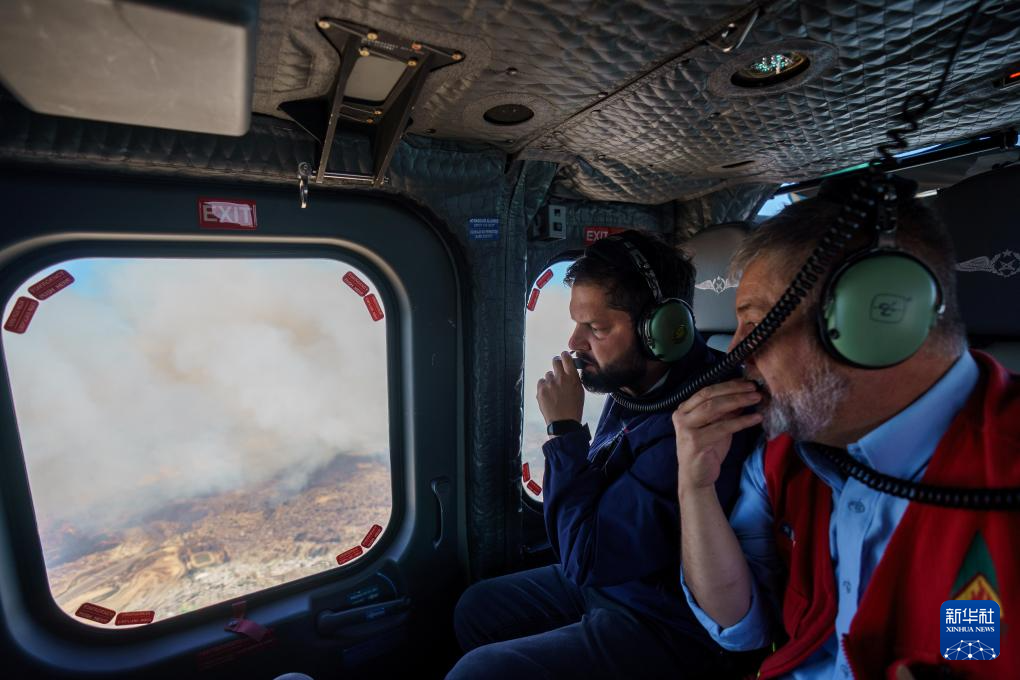 2月3日,智利总统博里奇(左)搭乘直升机在瓦尔帕莱索大区森林火灾受灾地区查看灾情。新华社发(智利总统府供图)