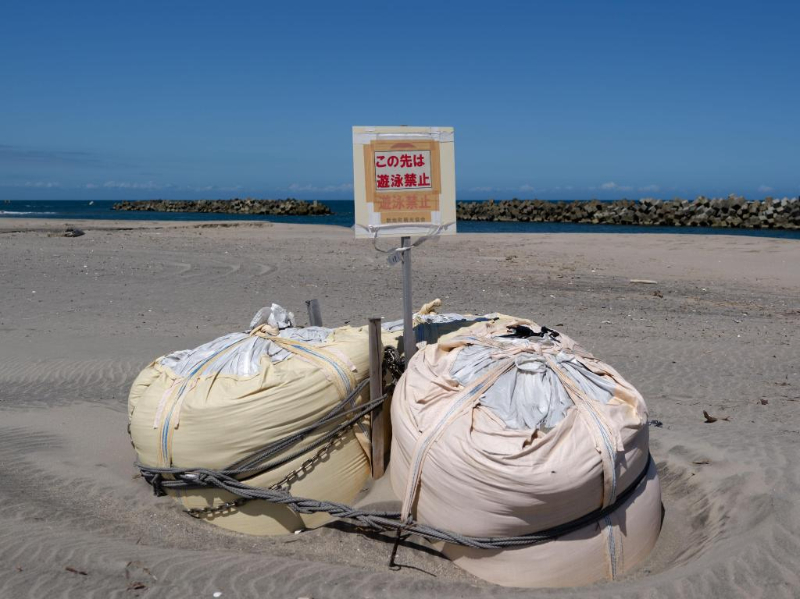 这是2023年8月22日在日本福岛县相马郡新地町钓师浜海水浴场拍摄的“禁止游泳”的告示牌。新华社记者张笑宇摄