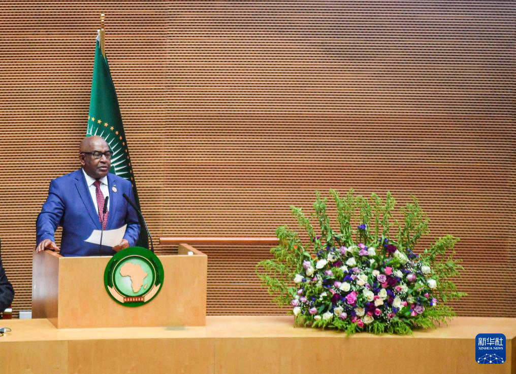 2月17日,在埃塞俄比亚首都亚的斯亚贝巴,非盟委员会主席法基在开幕式上发言。