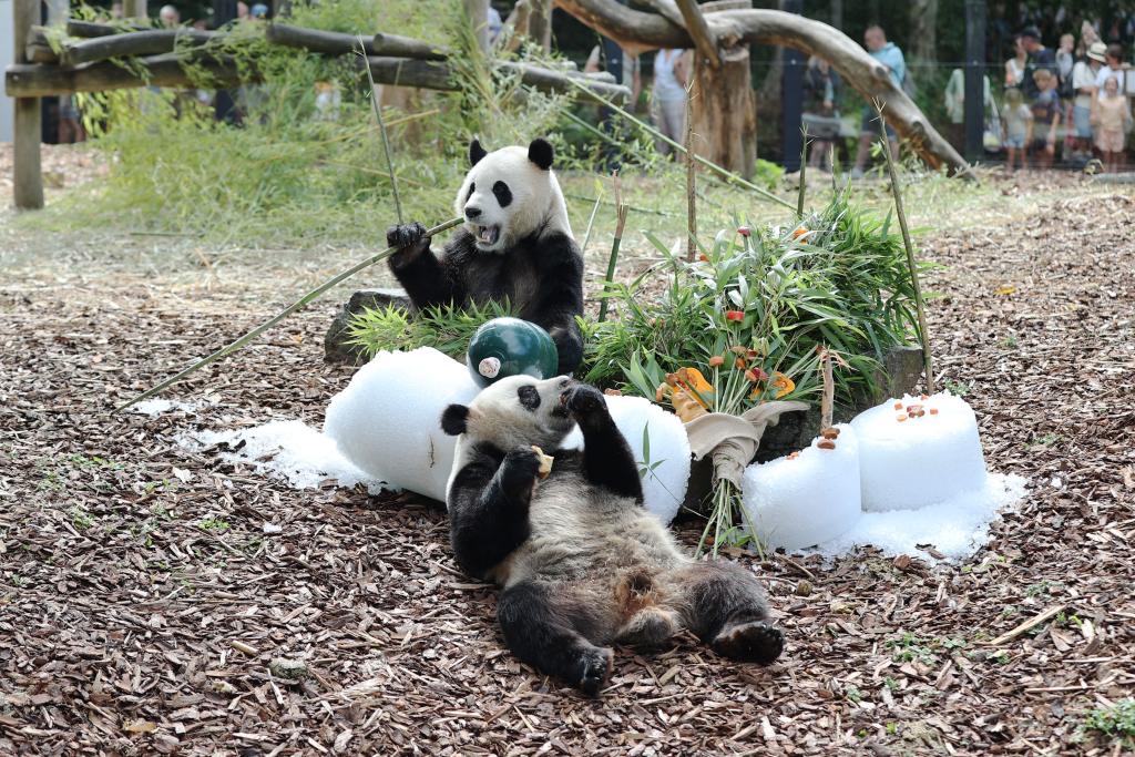 2023年8月16日,在比利时布吕热莱特的天堂动物园,大熊猫“宝弟”(上)、“宝妹”享用“生日大餐”。新华社记者 赵丁喆 摄