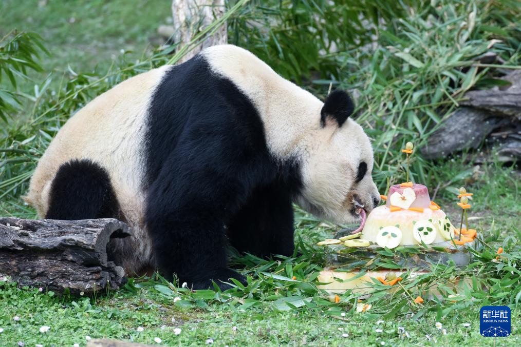 2月22日,在西班牙马德里,大熊猫“冰星”在马德里动物园举办的欢送仪式上吃蛋糕。新华社发(古斯塔沃·巴连特 摄)