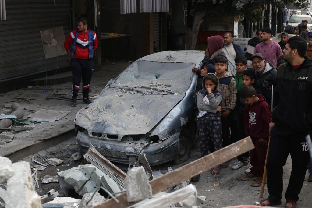 3月4日,在加沙地带南部城市拉法,人们查看空袭过后的废墟。新华社发(哈立德·奥马尔摄)
