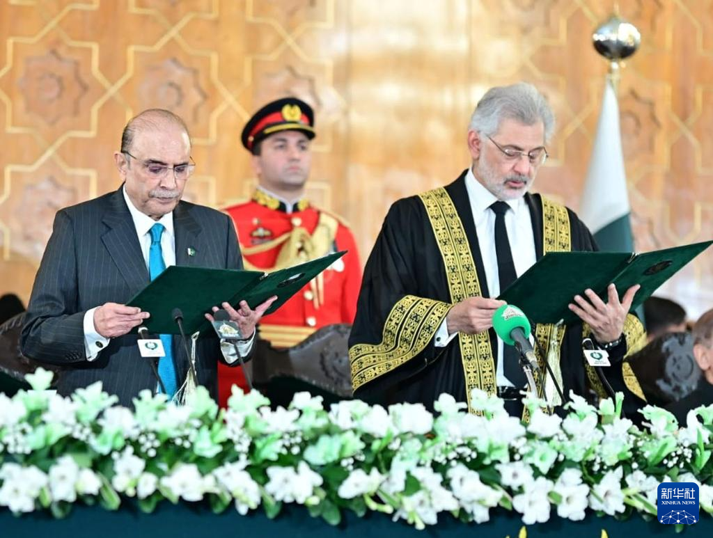 3月10日,在巴基斯坦伊斯兰堡总统府,巴基斯坦最高法院首席大法官卡齐·法伊兹·伊萨(右)主持当选总统阿西夫·阿里·扎尔达里的宣誓就职仪式。新华社发(巴基斯坦新闻与广播部下辖媒体信息部门供图)