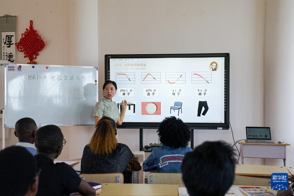 3月6日,在安哥拉首都罗安达,内图大学孔子学院教师孙云为学生们讲授中文。新华社记者 李亚辉 摄