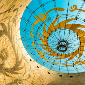 这是阳光透过成都金沙遗址博物馆陈列馆穹顶,在墙壁上投下太阳神鸟造型的影子(2022年3月10日摄)。新华社发(张艳摄)