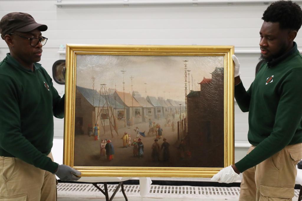 3月11日,在法国巴黎近郊的凡尔赛宫,工作人员准备打包油画《南京的集市》。在2024年中法建交60周年暨中法文化旅游年之际,凡尔赛宫和故宫博物院将于4月至6月在故宫共同举办“凡尔赛宫与紫禁城”展览。新华社记者高静摄
