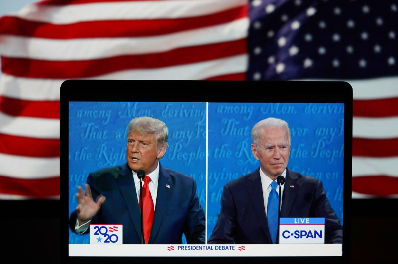 这张2020年10月22日拍摄的视频画面显示,美国时任总统特朗普(左)与当时的民主党总统候选人拜登在田纳西州纳什维尔市参加最后一场总统候选人电视辩论。新华社记者刘杰摄