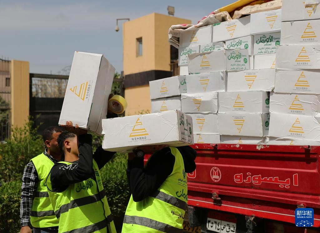 3月27日,工作人员在埃及法尤姆省装载慈善物资。新华社记者 王东震 摄