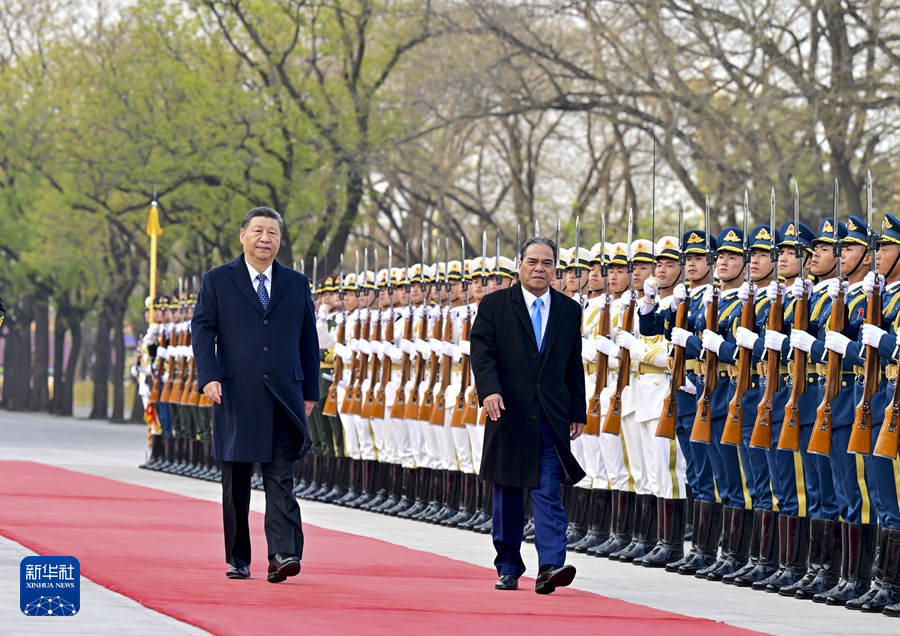 4月9日下午,国家主席习近平在北京人民大会堂同来华进行国事访问的密克罗尼西亚联邦总统西米纳举行会谈。这是会谈前,习近平在人民大会堂东门外广场为西米纳举行欢迎仪式。新华社记者 殷博古 摄