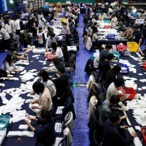 4月10日晚,工作人员在韩国首尔进行计票工作。(新华社发, 全休相摄)
