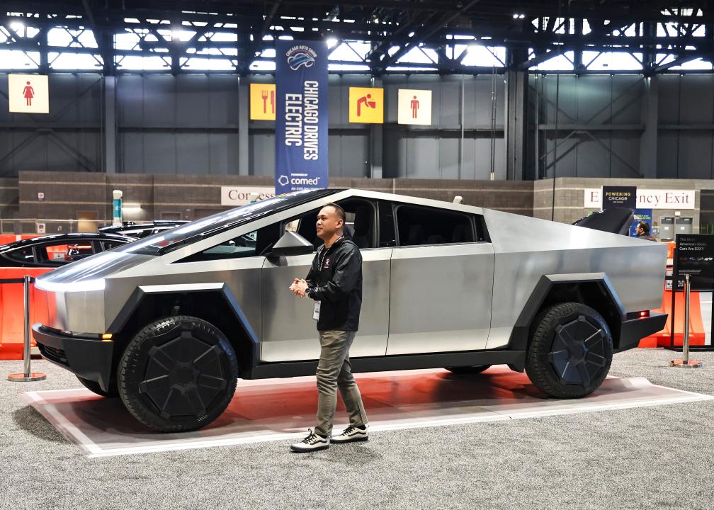 2月8日,在美国芝加哥麦考密克展览中心,一名记者站在特斯拉赛博皮卡车前。新华社发(乔尔·莱纳摄)