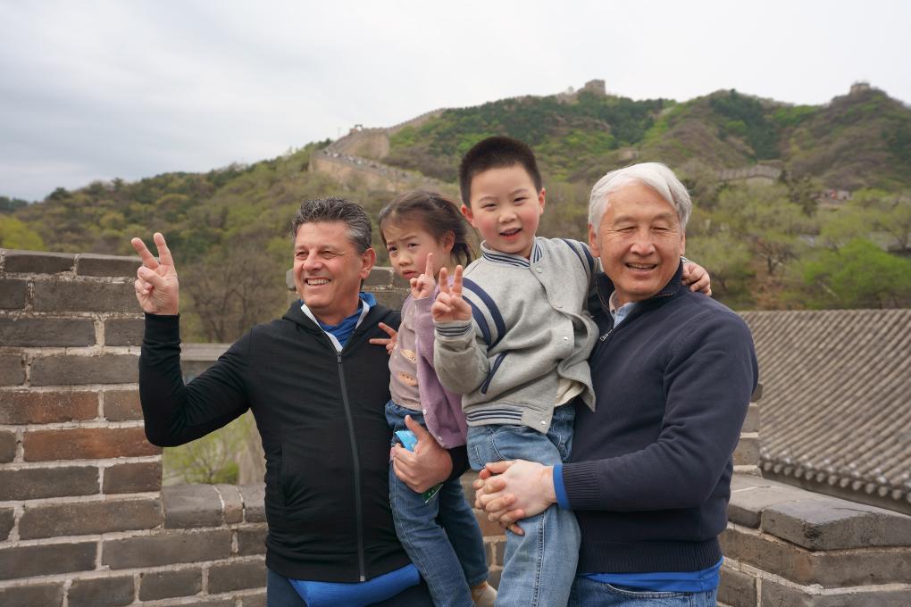 4月19日,美国艾奥瓦州友人卢卡·贝隆(左)在八达岭长城与中国孩子合影。