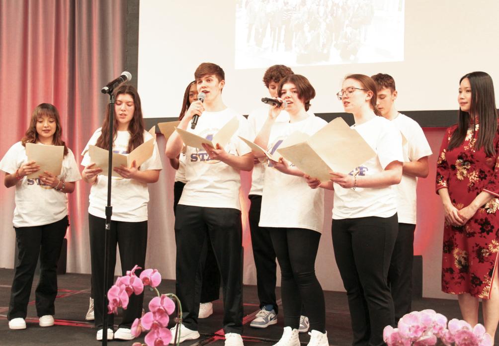 2月27日,在美国芝加哥,马斯卡廷中学学生用中文演唱《情缘留住永恒的记忆》。