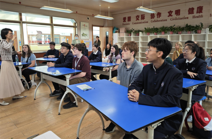 4月20日,在石家庄外国语学校,美国马斯卡廷中学师生同中国师生同上一节古诗课。