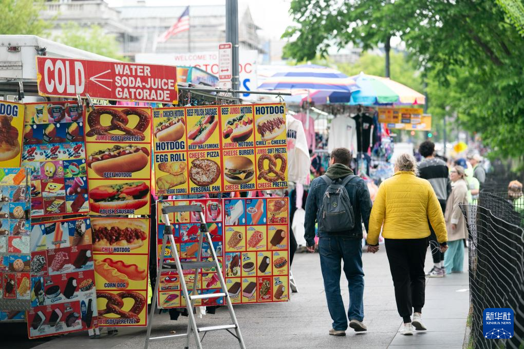 4月25日,在美国首都华盛顿,游客从白宫附近一辆食品售卖车旁经过。新华社记者 刘杰 摄