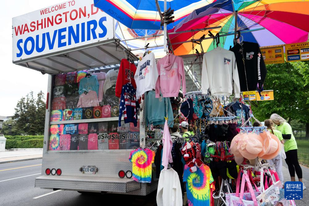 4月25日,在美国首都华盛顿,游客在一处白宫附近的纪念品摊位前选购商品。新华社记者 刘杰 摄