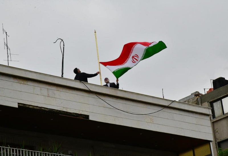 4月8日,在叙利亚首都大马士革,伊朗驻叙利亚使馆领事部门新址升起伊朗国旗。新华社发(阿玛尔摄)