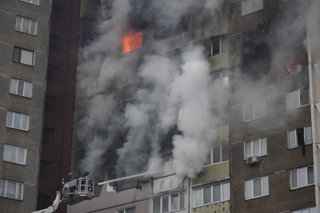 2月7日,俄罗斯军队对乌克兰首都基辅等地发动空袭。图为消防员在基辅为被导弹碎片击中的居民楼灭火。新华社发(罗曼·佩图什科夫摄)