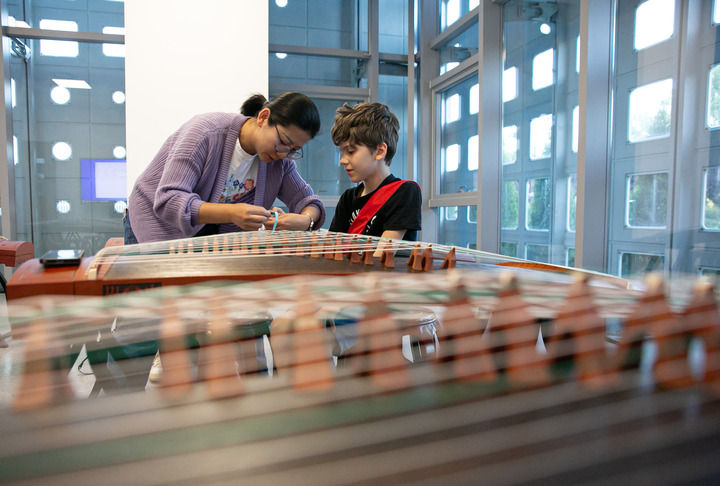 2024年4月29日,在塞尔维亚贝尔格莱德中国文化中心,古筝指导老师王宣(左)在教学。新华社记者 李京 摄
