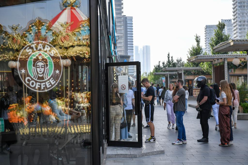 2022年8月22日,人们在俄罗斯莫斯科排队等待进入一家“星咖啡”门店。新华社发(亚历山大摄)