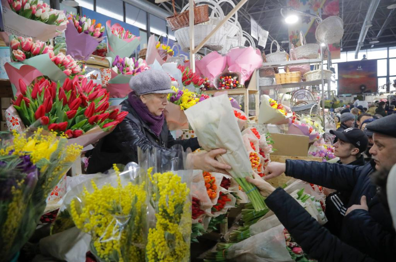 2023年3月8日,人们在俄罗斯首都莫斯科的市场购买鲜花。新华社发(亚历山大摄)