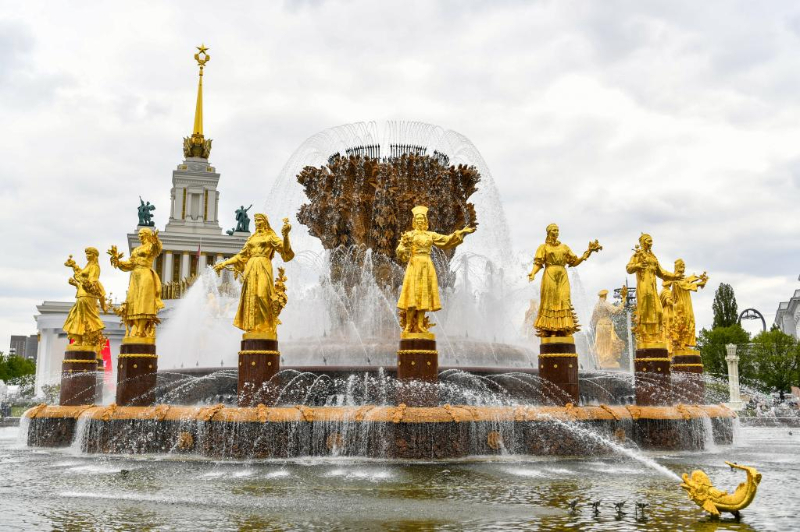 这是5月13日在俄罗斯首都莫斯科拍摄的国民经济成就展览馆的喷泉。新华社记者曹阳摄