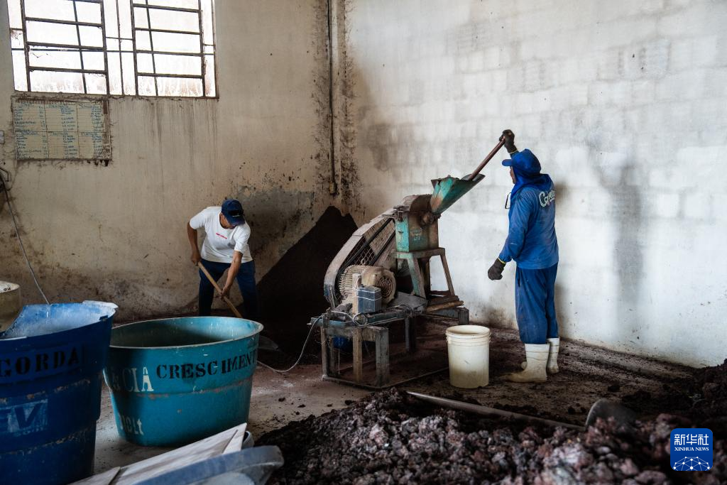 5月22日,在巴西巴伊亚州卡萨诺瓦的一处农场内,工作人员使用生产葡萄汁和果酱剩下的葡萄皮和葡萄籽制作饲料。新华社记者 王天聪 摄