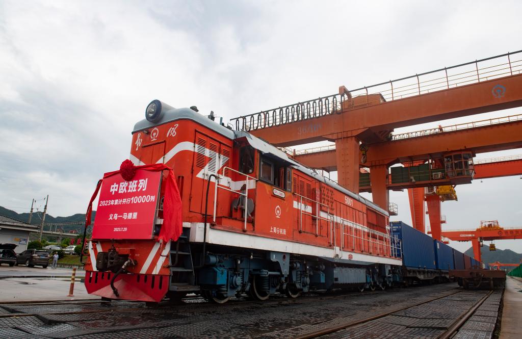 2023年7月29日,满载110个标箱出口货物的X8020次中欧班列从铁路义乌西站鸣笛启程。新华社发(时宽兵摄)