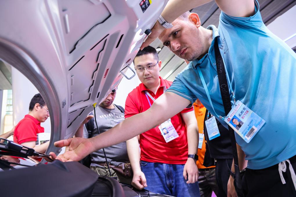 2024年4月15日,采购商在广交会新能源汽车展区详细了解比亚迪的一款经济型新能源汽车。新华社记者刘大伟摄