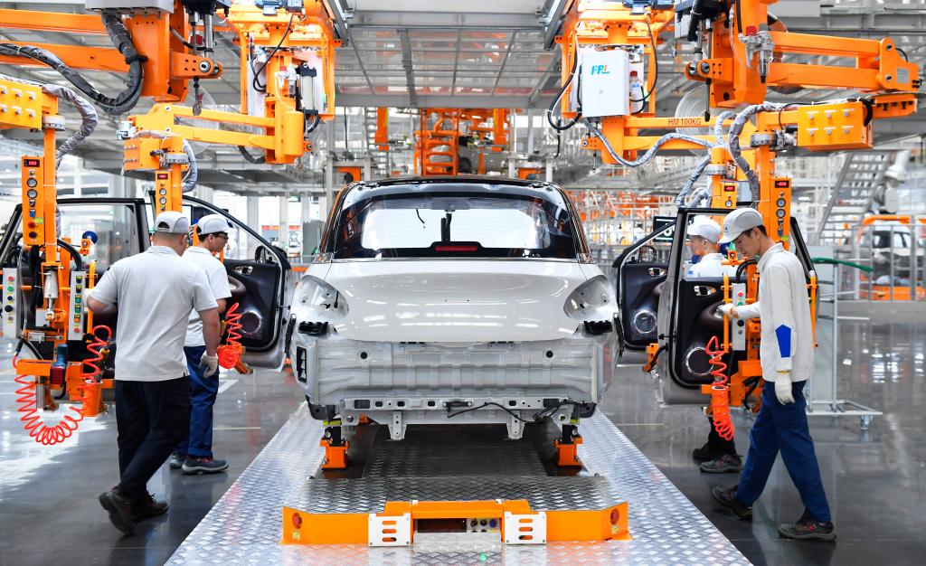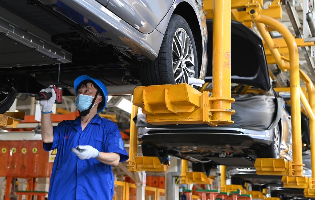 2022年4月20日,工作人员在陕西西安比亚迪草堂工业园汽车总装厂进行新能源汽车装配。新华社记者刘潇摄