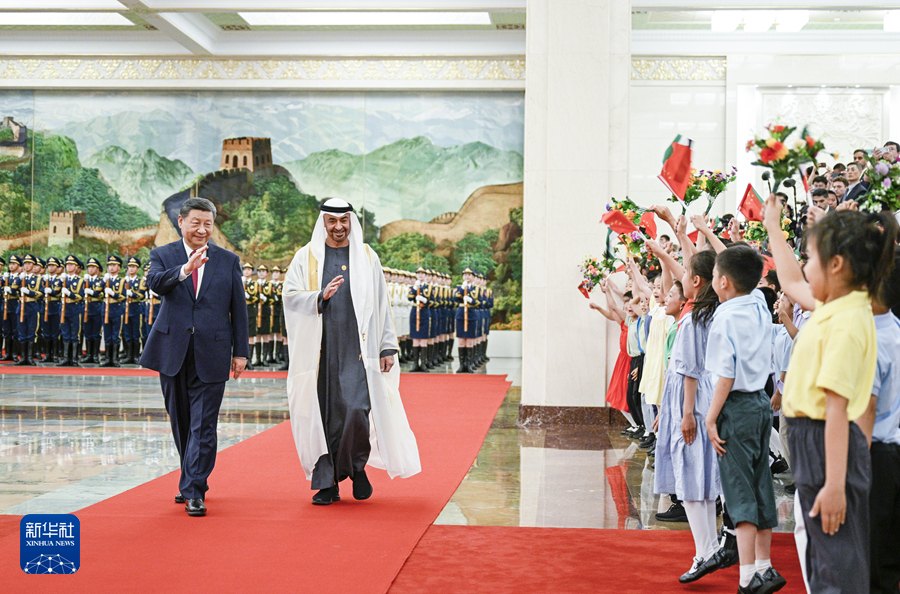 5月30日下午,国家主席习近平在北京人民大会堂同来华国事访问并出席中国-阿拉伯国家合作论坛第十届部长级会议开幕式的阿联酋总统穆罕默德举行会谈。这是会谈前,习近平在人民大会堂北大厅为穆罕默德举行欢迎仪式。新华社记者 饶爱民 摄