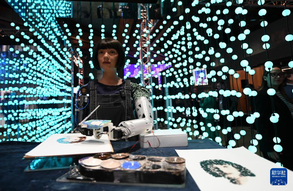 5月30日,在瑞士日内瓦举行的2024年“人工智能造福人类全球峰会”上,绘画艺术家机器人Ai-Da在画画。