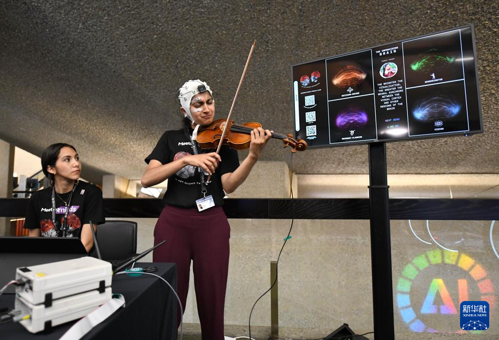 5月30日,在瑞士日内瓦举行的2024年“人工智能造福人类全球峰会”上,参会者头戴脑神经检测器在人工智能艺术表演上演奏小提琴。