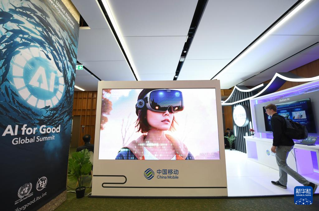 5月30日,在瑞士日内瓦举行的2024年“人工智能造福人类全球峰会”上,参会者走进中国移动的展台。