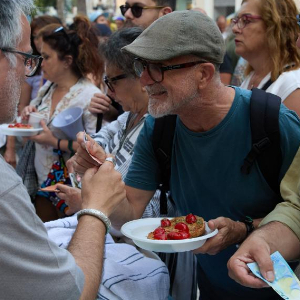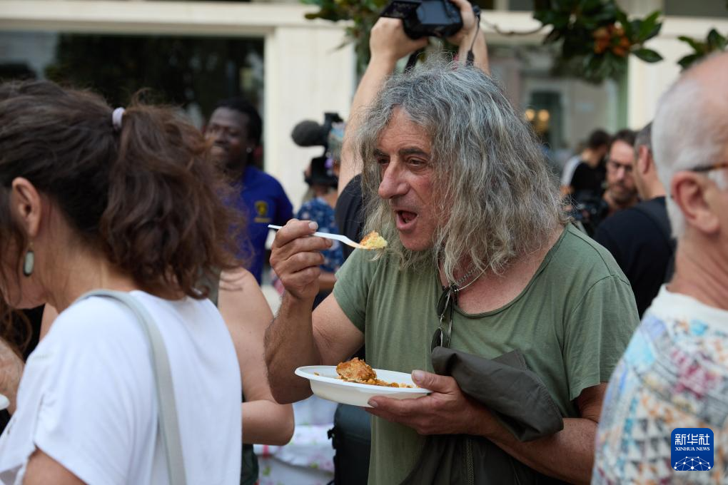 6月13日,民众在意大利布林迪西参加集会现场的义餐活动。新华社记者 孟鼎博 摄