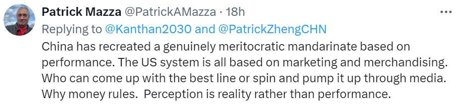 美国博主帕特里克·马扎点赞中国基于绩效的任人唯贤制,并称美国的制度基于营销: