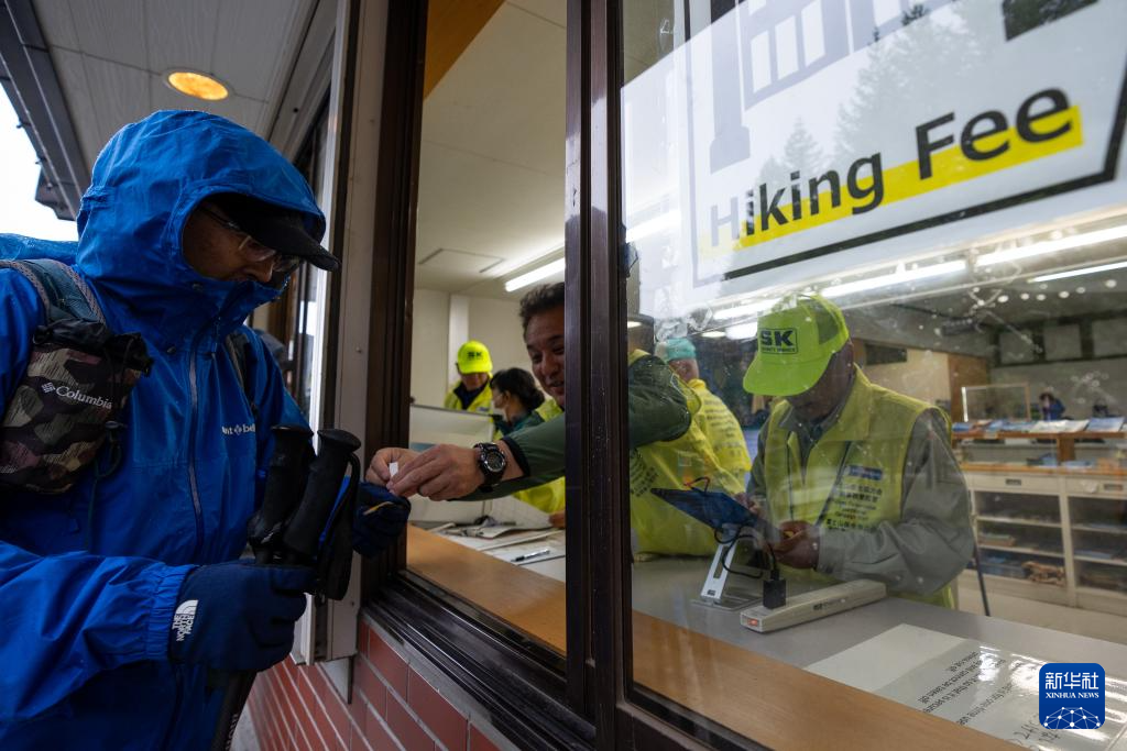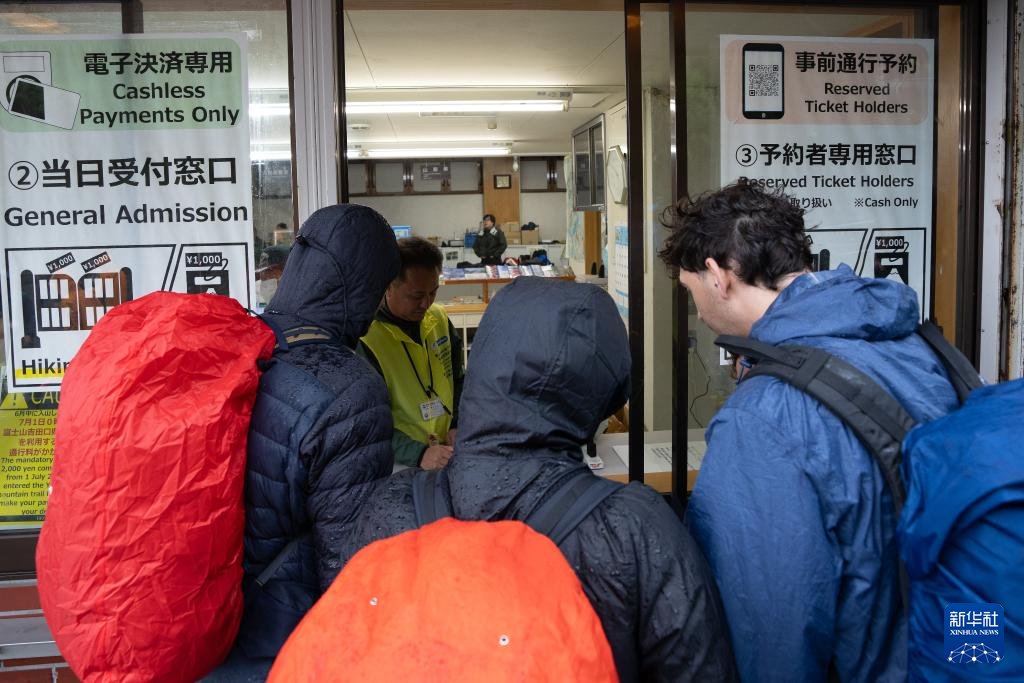 7月1日,登山者在日本山梨县富士山吉田路线五合目登山口购票处支付登山通行费。