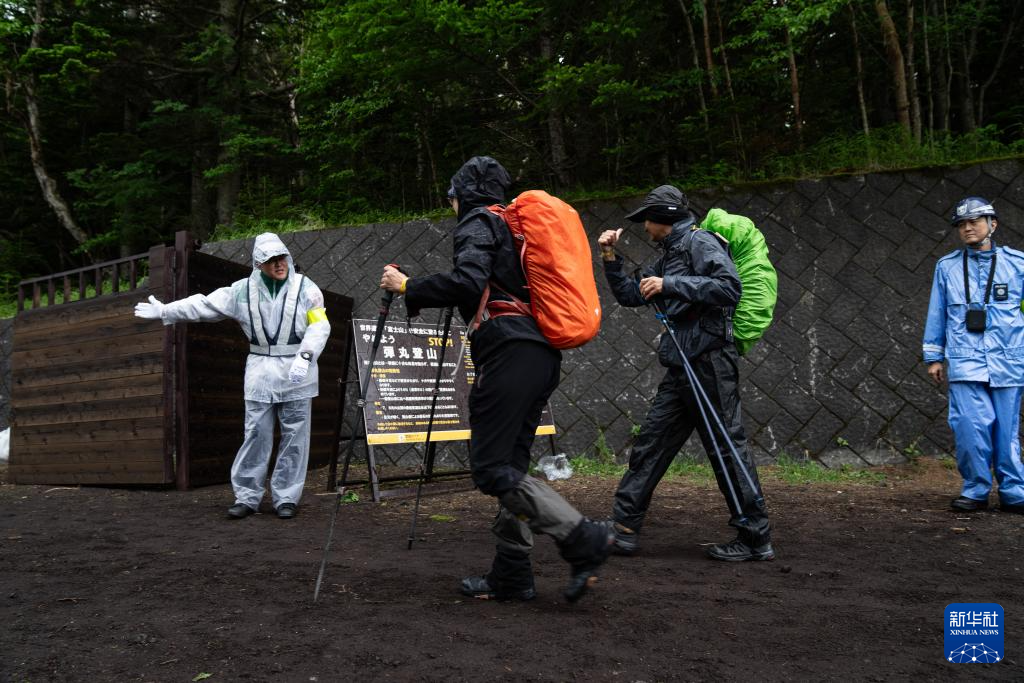 7月1日,工作人员在日本山梨县富士山吉田路线五合目登山口新加装的大门前确认登山者是否佩戴象征支付登山通行费的腕带。