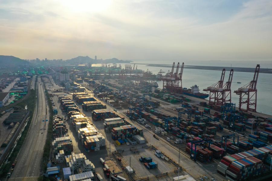 这是2023年5月9日拍摄的连云港港集装箱码头(无人机照片)。中哈连云港物流合作基地是“一带一路”倡议首个实体平台项目,成为哈萨克斯坦直抵太平洋的出海口。(新华社记者季春鹏摄)