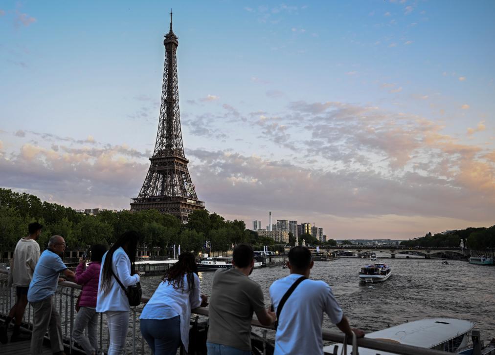 7月1日,游客在塞纳河畔观看悬挂奥运五环的埃菲尔铁塔。新华社记者贺长山摄