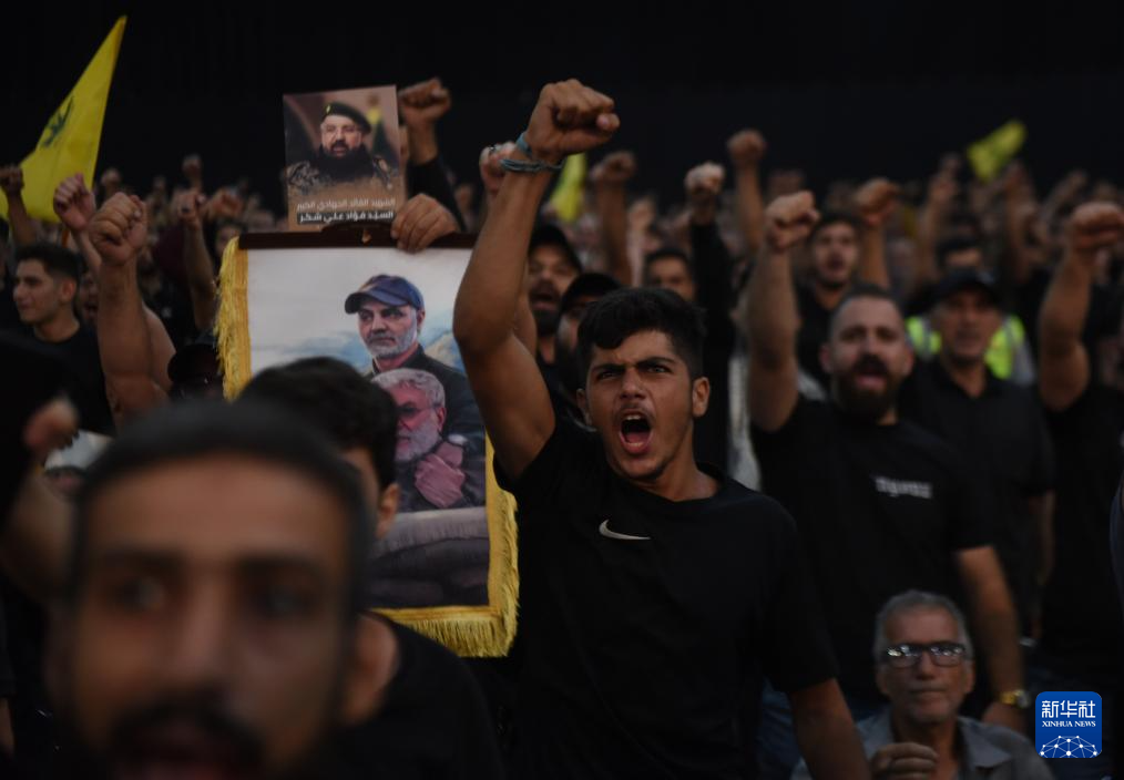 8月6日,在黎巴嫩首都贝鲁特,真主党支持者在纪念真主党高级军事指挥官福阿德·舒库尔的活动上呼喊口号。新华社发(比拉尔·贾维希摄)
