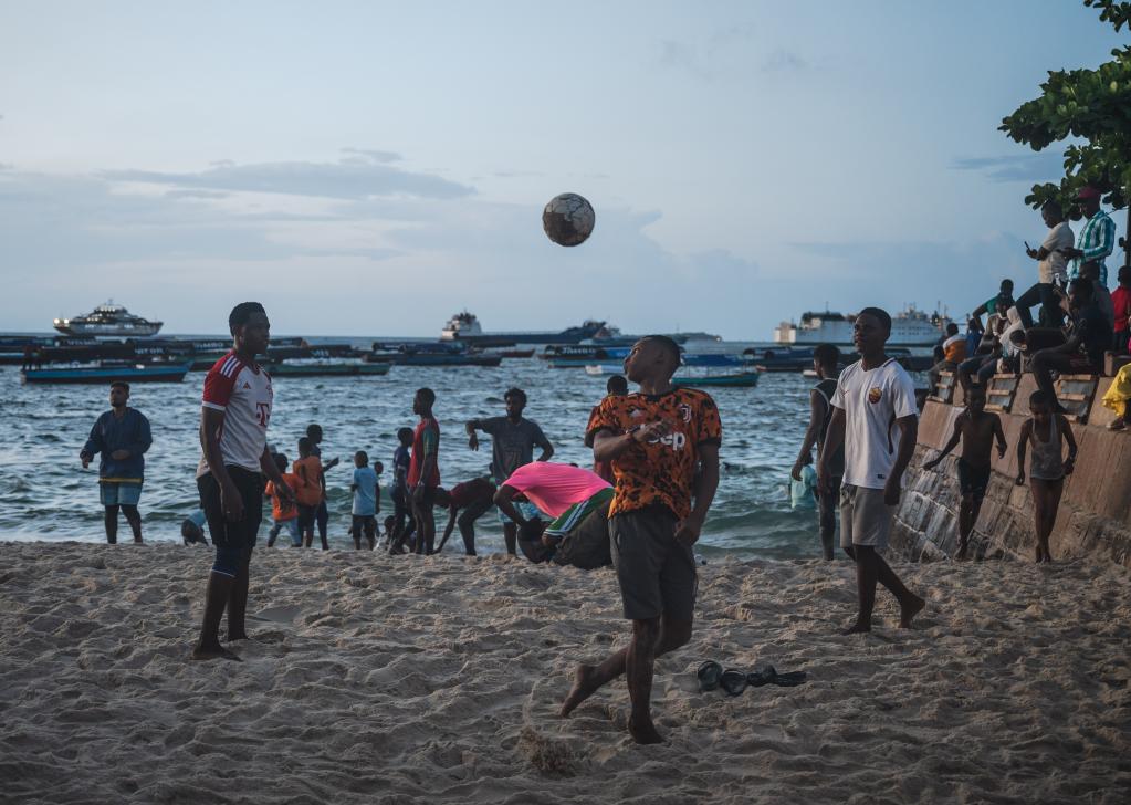 2023年12月31日,人们在坦桑尼亚桑给巴尔岛海滨踢球。新华社记者王冠森摄