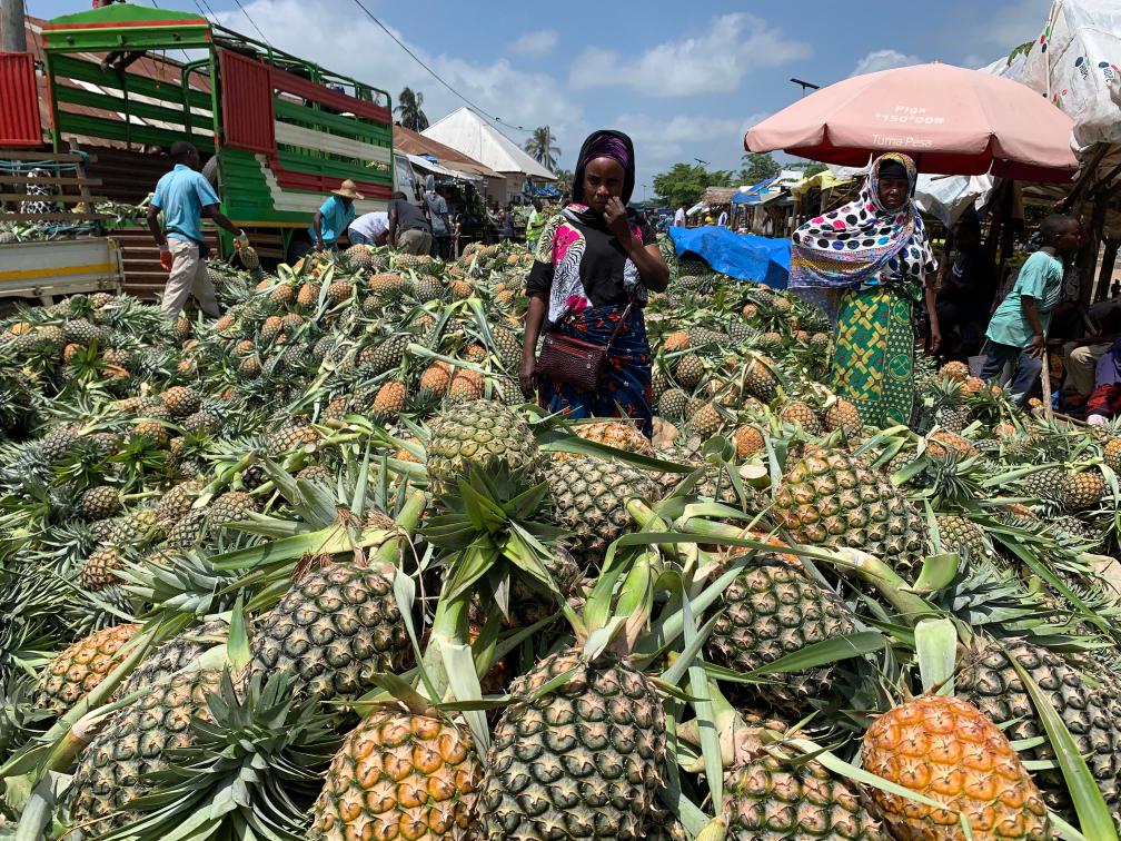 2023年12月20日,在坦桑尼亚巴加莫约地区的基旺瓦村,水果商和农民在菠萝收获季搬运菠萝。新华社发(赫尔曼·埃马纽埃尔摄)