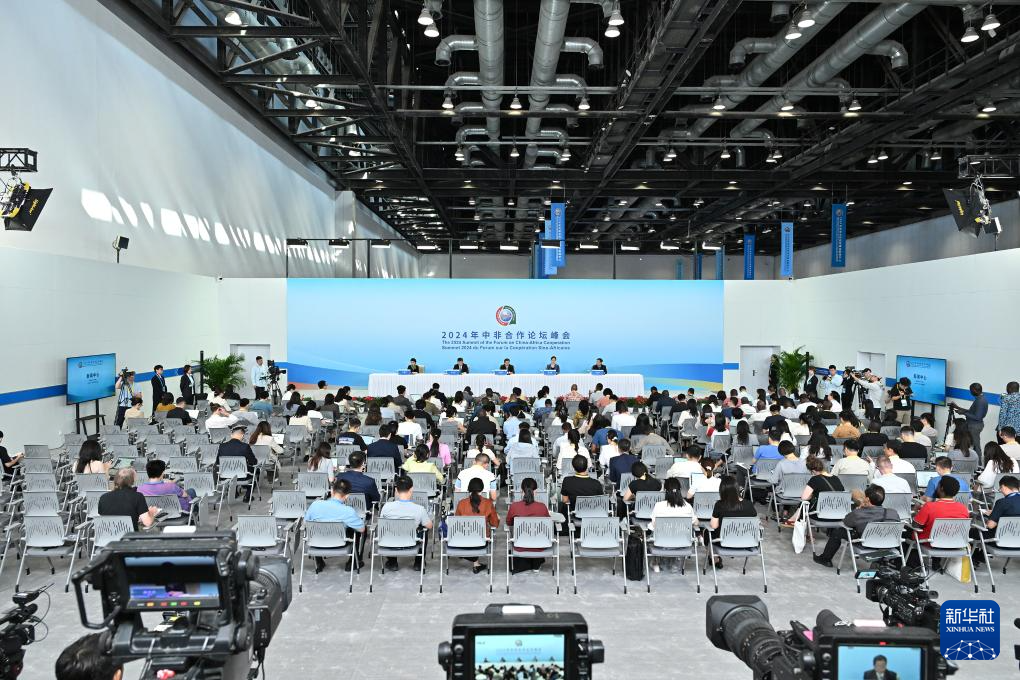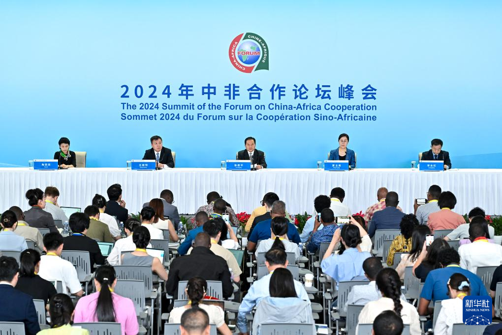 9月2日,2024年中非合作论坛峰会新闻中心举行首场吹风会,国家发展和改革委员会区域开放司司长徐建平、中共中央对外联络部四局局长王赫明、国家税务总局国际税务司司长蒙玉英、生态环境部对外合作与交流中心副主任李永红介绍中非共建“一带一路”合作情况,并回答记者提问。新华社记者 李鑫 摄