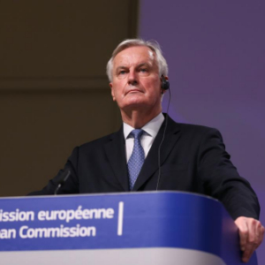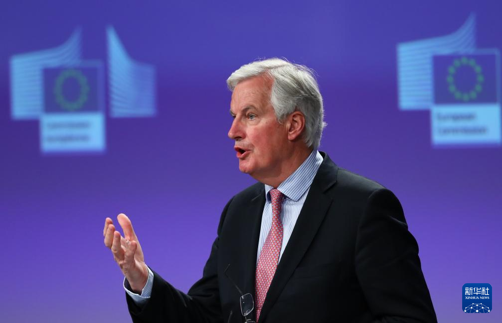 这是2020年12月24日,米歇尔·巴尼耶在比利时布鲁塞尔的欧盟委员会总部出席新闻发布会时的资料照片。 新华社记者 郑焕松 摄