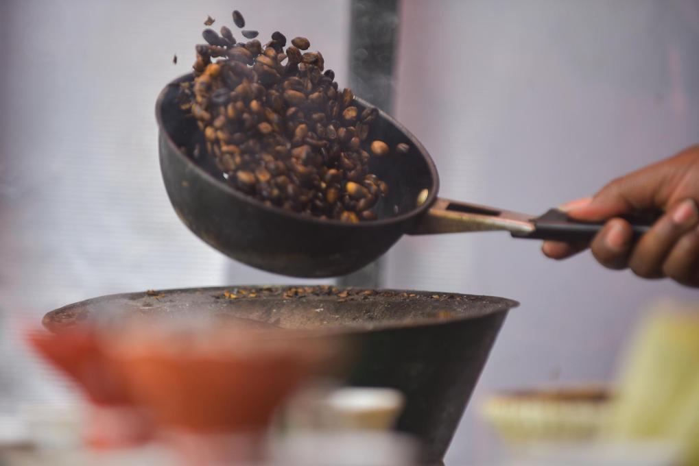 2021年5月14日,商贩在埃塞俄比亚亚的斯亚贝巴街头的咖啡摊炒咖啡豆。新华社发(迈克尔·特韦尔德摄)